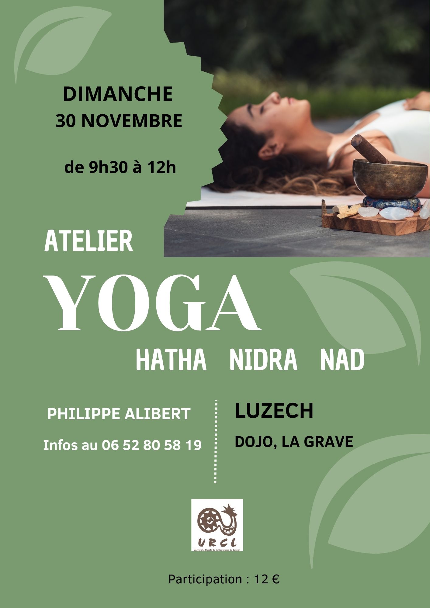 Philippe Alibert enseigne le yoga au sein de l'association URCL (le mardi à 18h, le mercredi à 17h au dojo de la salle La Grave) et propose une matinée de YOGA (Hatha, Nidra, Nad) le dimanche 30 novembre de 9h30 à 12h Participation 12 € - Infos au 06 52 80 58 19