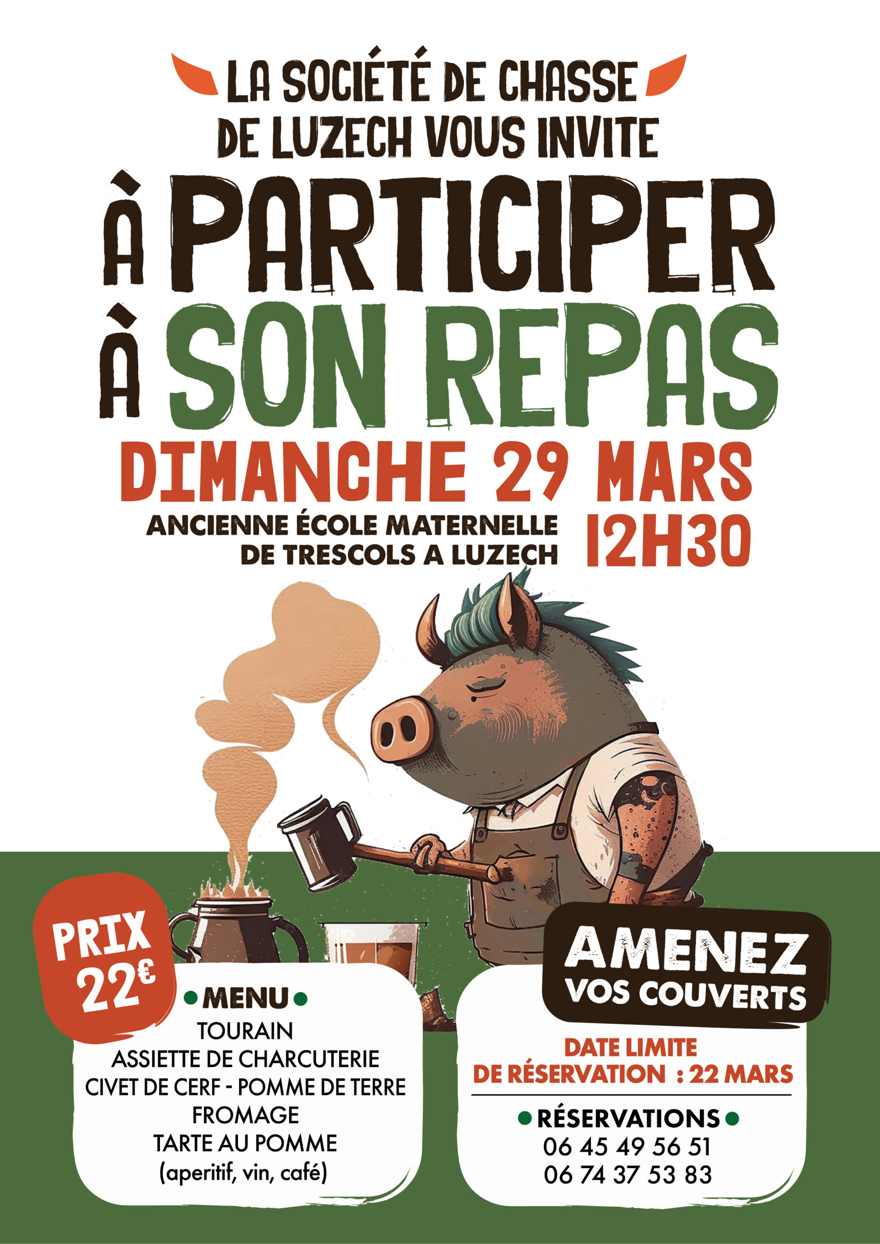 Dimanche 29 mars, repas proposé par la Société de chasse : 12h30 à l'espace de loisirs Trescols Infos / réservations au 06 45 49 56 51 / 06 74 37 53 83 (avant le 22 mars)