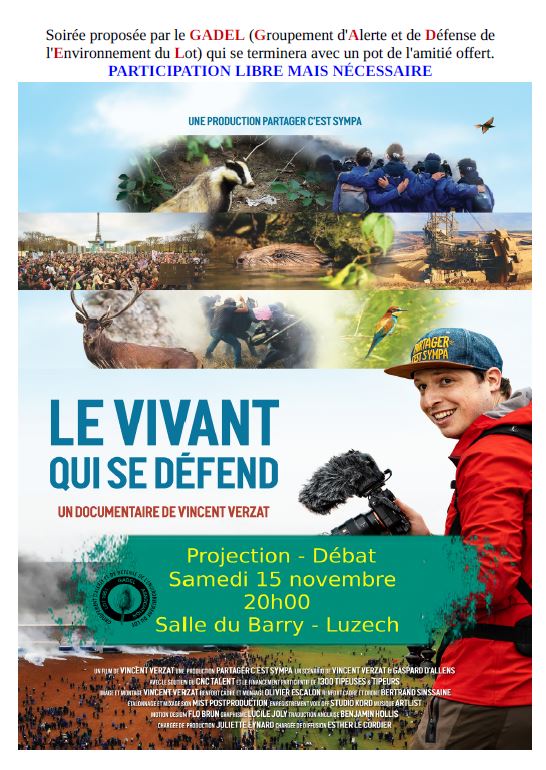 Samedi 15 novembre à la Salle du Barry à 20h, projection du documentaire « Le vivant qui se défend » : un documentaire de 90 minutes de Vincent Verzat retrace son cheminement entre militantisme et naturalisme. Il fait le lien entre les animaux sauvages et les luttes menées partout en France contre la destruction de leur habitat.